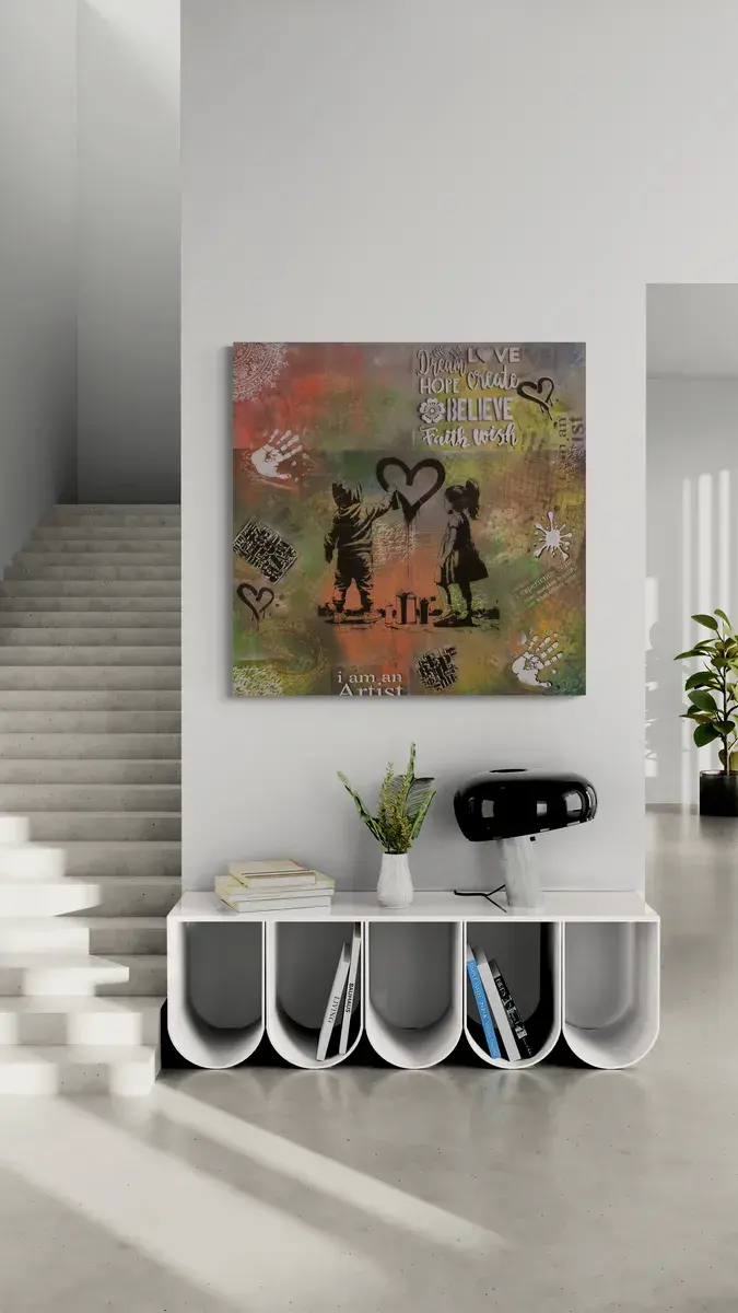 "Spray the Love" Een ode aan creativiteit en verbinding. Dit kunstwerk vangt de speelse energie van twee kinderen die samen een hart spuiten, omringd door inspirerende woorden zoals ‘Dream’, ‘Hope’, en ‘Believe’. Met warme kleuren, verfspatten en urban details straalt het een boodschap van liefde en positiviteit uit. Een herinnering dat kunst de wereld mooier kan maken.